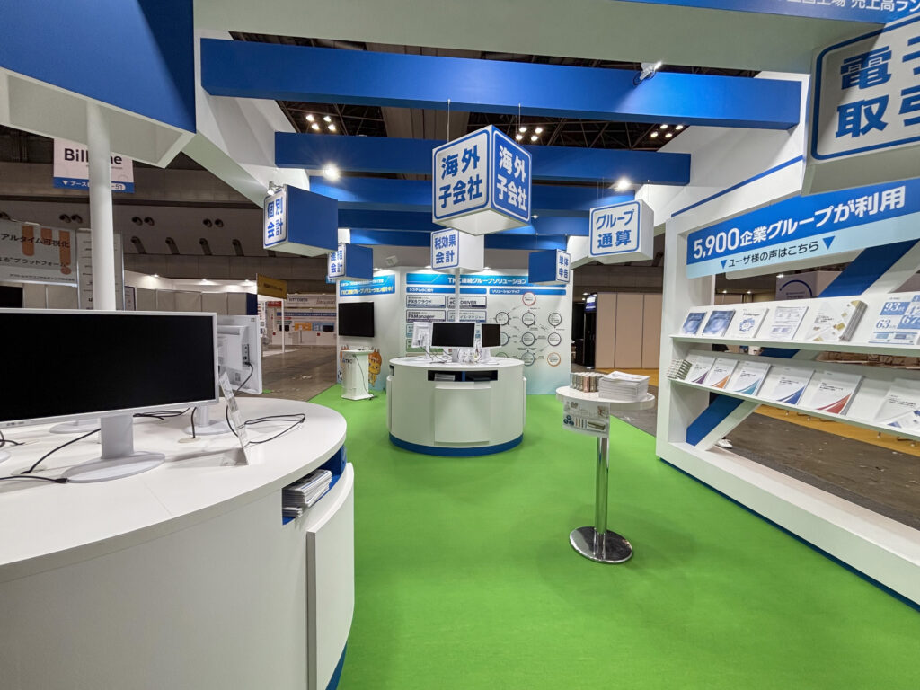外周に設置した木工ボーダーで企業の存在感とアイコニックなボックス型のサービス訴求で個性的でありつつも、「わかりやすさ」を意識し、機能面も備えたブースをご提案できました。