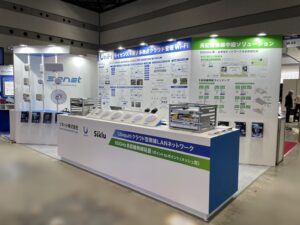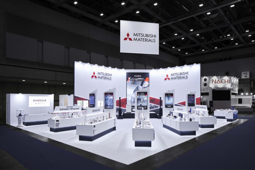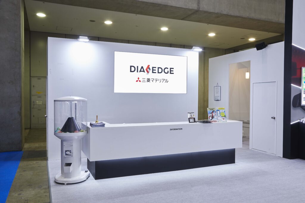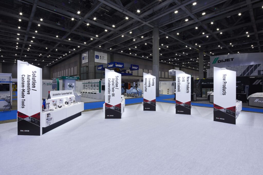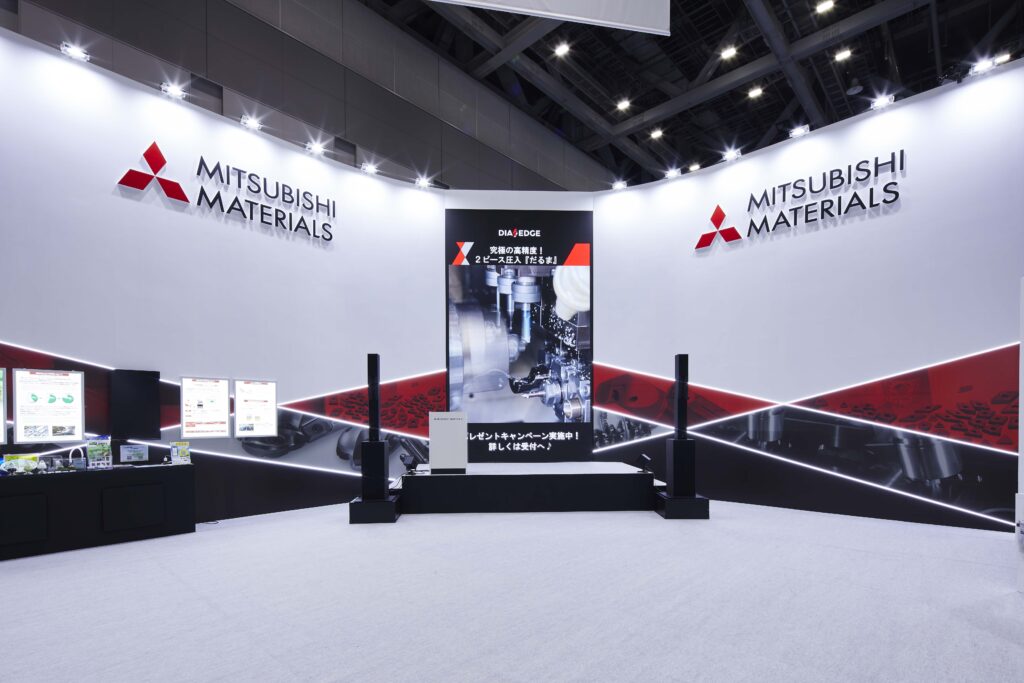 大型の壁面とシンプルな配色でブースを構成し、洗練された空間を創出しました。ステージには300インチの縦型モニターを、展示コーナーにも縦型モニターを配置することで、視覚的なインパクトを最大化したブースを設計しました。